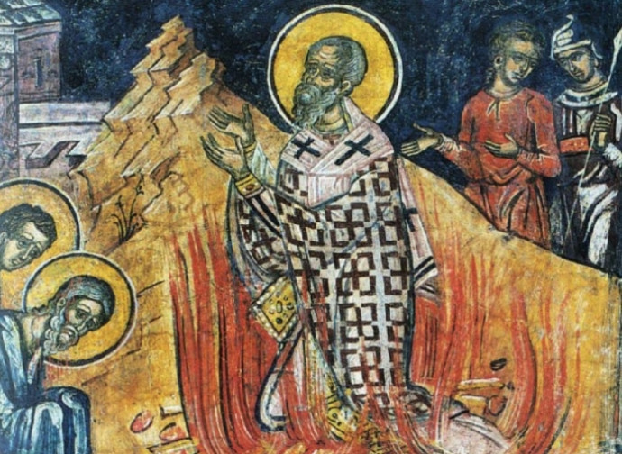 At the end of his prayer of praise the fire was set and then, so continues the letter from the Church of Smyrna, "we saw a prodigy and were allowed to see it. We survived to tell others about these events". The flames circled around the Saint's body, without touching it, while a smell of incense was spreading. Eventually, seeing that the fire did not consume him, it was ordered that he be pierced with a dagger, so Polycarp became the twelfth Christian to suffer martyrdom in Smyrna.