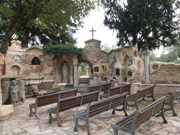 Madonna dell’Ulivo is a small open-air chapel with walls reminiscent of the architecture of Antoni Gaudí. It was built piece by piece according to a design he had in mind, blending ancient and modern sacred objects into a harmonious whole that expresses the creator's love for Christ and the Virgin Mary. Every time we went to see him, it was a must-visit, and it was irresistibly fascinating to hear him explain every detail of the structure, as well as the origin and reason behind the latest additions.