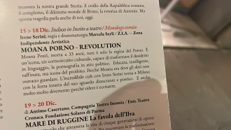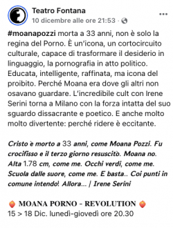 Così, ha debuttato ieri sera e resterà in cartellone fino a giovedì lo spettacolo Moana – porno revolution, scritto e interpretato da Irene Serini e diretto da Marcela Serli. Qualche info? Sul sito del teatro, la presentazione è affidata a parole di questo tenore: «Un capolavoro comico che, a distanza di anni dal debutto, torna in scena con la forza intatta del suo sguardo poetico e anticonvenzionale». Nientemeno.