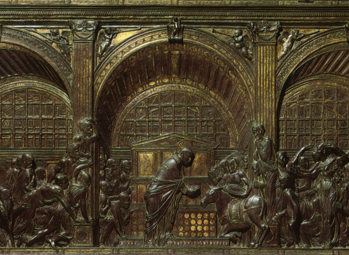 Cessino le parole, parlino le opere. Facciamocele dunque raccontare dai rilievi che adornano il fronte dell’altare. Sono quattro in tutto e sono collocati esattamente sotto le sculture a tutto tondo. Per inciso, la sistemazione attuale del prezioso manufatto artistico non è quella originaria, essendo stata l’ara smontata, smembrata tra varie parti della chiesa e riassemblata dall’architetto Camillo Boito, alla fine dell’Ottocento, in maniera arbitraria.