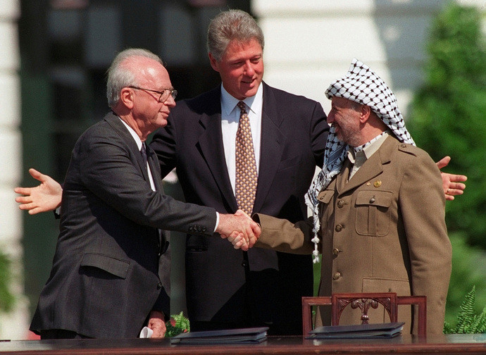 Rabin fu assassinato dal 25enne Yigal Amir, esponente del gruppo estremista israeliano Eyal, un acronimo in ebraico che sta per Organizzazione ebraica nazionale. Due colpi di pistola alla schiena mentre lasciava il palco di una manifestazione in favore del processo di pace: la sua colpa era stata quella di aver firmato a Oslo l’accordo del 1993 con il leader palestinese Yasser Arafat (che valse a entrambi il premio Nobel per la pace nel 1994), che prevedeva il ritiro delle truppe israeliane da una parte di Gaza e della Cisgiordania, territori in cui si costituiva l’Autorità Nazionale Palestinese (ANP), che da parte sua rinunciava a perseguire la distruzione di Israele. Si era ancora distanti dal realizzare “due popoli, due Stati”, ma per la prima volta dopo quasi 50 anni si intravvedeva una possibilità concreta di soluzione politica della guerra israelo-palestinese.