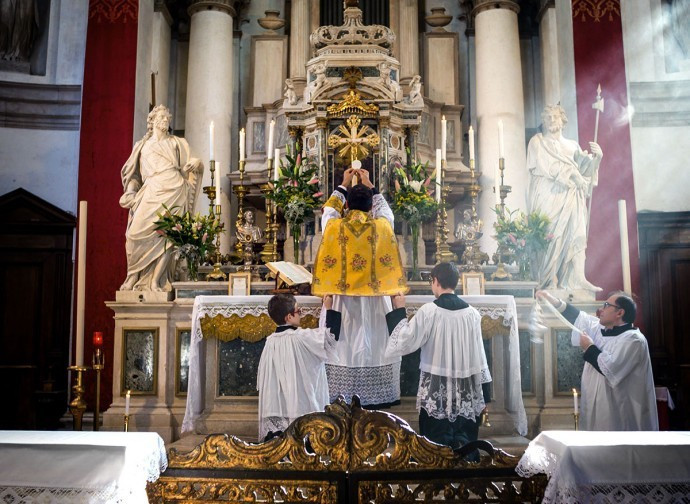 Perché i cristiani hanno così tanto insistito sulla preghiera rivolta ad oriente? Perché hanno fatto tutto il possibile per costruire chiese e altari orientati? Perché tanta attenzione e tanta insistenza? Prima di indagare sulla ricchezza di significato dell’orientamento della preghiera, che abbiamo in parte già presentato (vedi qui), è necessario richiamare un principio fondamentale che, nello spiritualismo che ha invaso il mondo cattolico, spiritualismo che si traduce in una esclusività dell’interiorità a detrimento dell’esteriorità, abbiamo dimenticato. «Non è senza motivo né per caso che ci prostriamo in adorazione verso oriente, ma è perché siamo costituiti dalla natura visibile e invisibile, ossia intelligibile e sensibile, sicché compiamo una duplice adorazione rivolta all’Artefice» (Esposizione della Fede, 85).