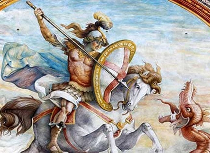 Il racconto della sua vittoria sul drago emerse invece solo intorno al XII secolo e conobbe una straordinaria popolarità a partire dal secolo successivo, perché incluso nella Legenda Aurea di Jacopo da Varagine e raffigurato da tantissimi artisti. La liberazione della fanciulla e di tutti gli abitanti che erano soggetti al potere del drago è una bella immagine della liberazione dal peccato e dalle catene del demonio: «Non temete, perché il Signore mi ha permesso di liberarvi da questo mostro. Credete, ricevete il Battesimo e io ucciderò il vostro persecutore», dice Giorgio nella Legenda. Nel frattempo, la celebre croce rossa in campo bianco, nota come Croce di San Giorgio, era divenuta il simbolo dei crociati e della Repubblica di Genova, che poi concesse all’Inghilterra la possibilità di utilizzarla sulle sue navi. Proprio l’Inghilterra, il cui re Edoardo III introdusse il grido di battaglia «Saint George for England», è una delle nazioni ad avere come patrono san Giorgio. Il quale è inoltre protettore di diversi ordini cavallereschi.