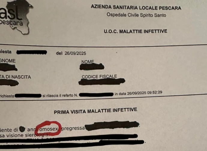 Il medico scrive sul referto «paziente omosex» e subito si scatena la reazione della comunità Lgbt che urla alla discriminazione. È successo in un ambulatorio di Pescara dove un sessantunenne si era recato per una visita. L’uomo ha denunciato il trattamento discriminatorio in un post sui social e poi su un’intervista al Messaggero: «Mi sono sentito umiliato, mi chiedo se avrebbero fatto così con un paziente eterosessuale», ha spiegato indignato.
